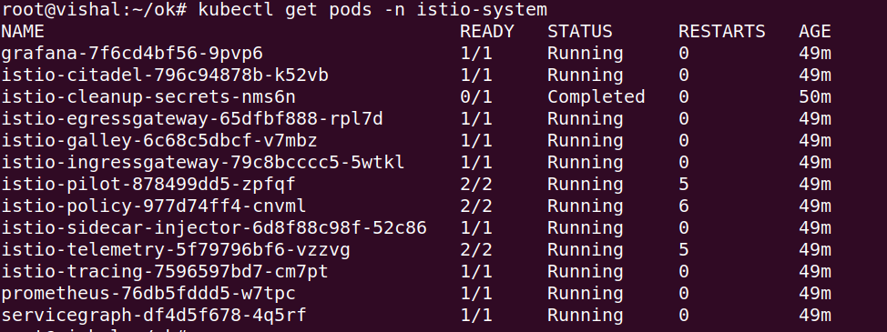 Ensure the corresponding Kubernetes pods are deployed and all containers are up and running: istio-pilot-*, istio-policy-*, istio-telemetry-*, istio-ingressgateway-*, and istio-citadel-*.
